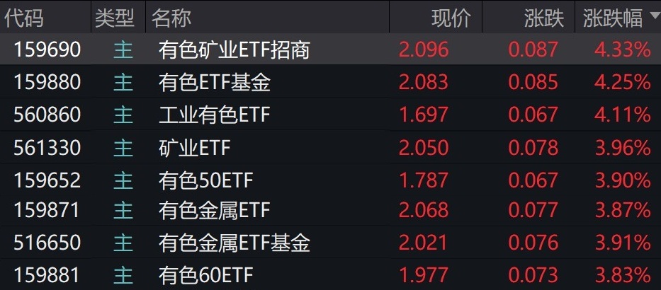 受盘面影响,有色、矿业相关ETF涨约4%。