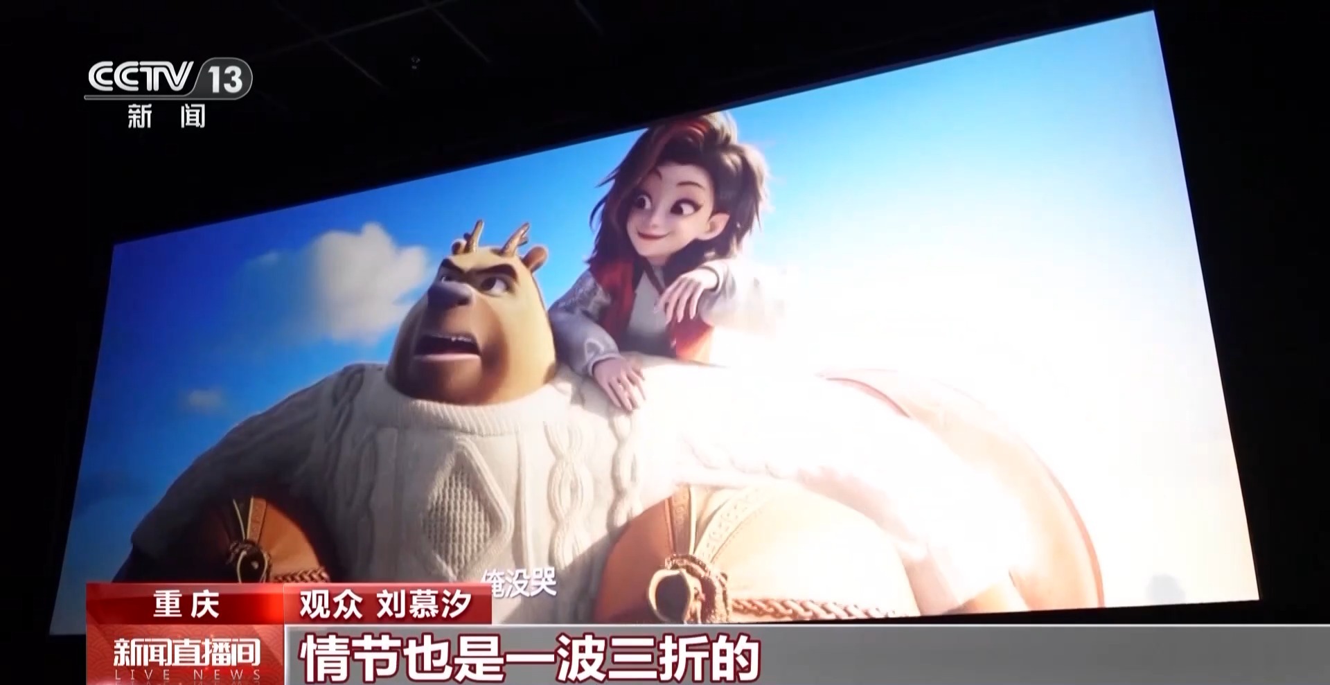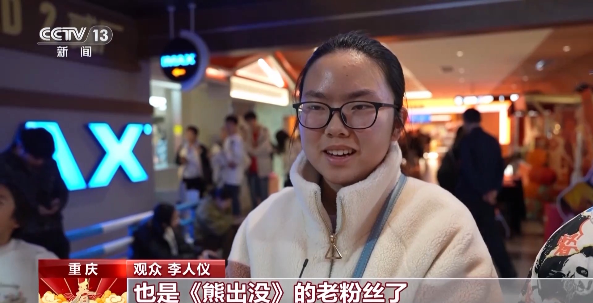 观众 李人仪:也是《熊出没》的老粉丝了,经常来看《熊出没》,里面以重庆为采景地的江,年关城里的红灯笼、鞭炮、年兽,很有过年的氛围。
