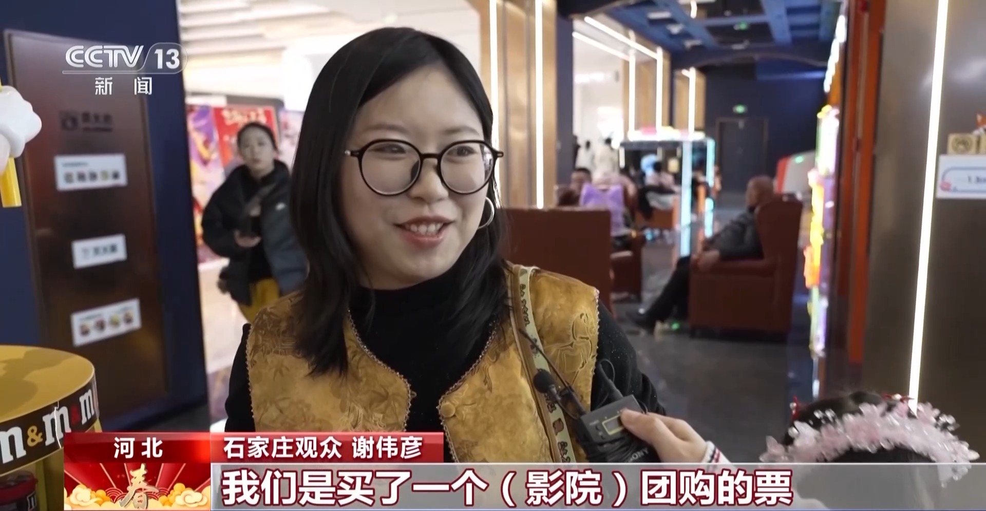 石家庄某影院经理 薛亚丽:我们影院也积极参与了这个惠民活动。通过线上渠道购买影票,能立减5到10元。我们春节一共上映6部影片,有适合一家老小的喜剧片,还有国安题材的影片。现在我们推出了一个亲子套票,小朋友可以免费观影,只需要购买大人影票就可以了。