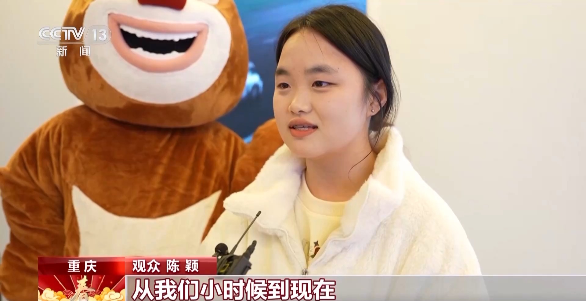 观众 陈颖:从我们小时候到现在,其实每年都在看,包括《熊出没》那几部系列动画片。今天这个年味非常浓厚,还有这样一个玩偶,我就觉得非常有体验感,很有沉浸感。