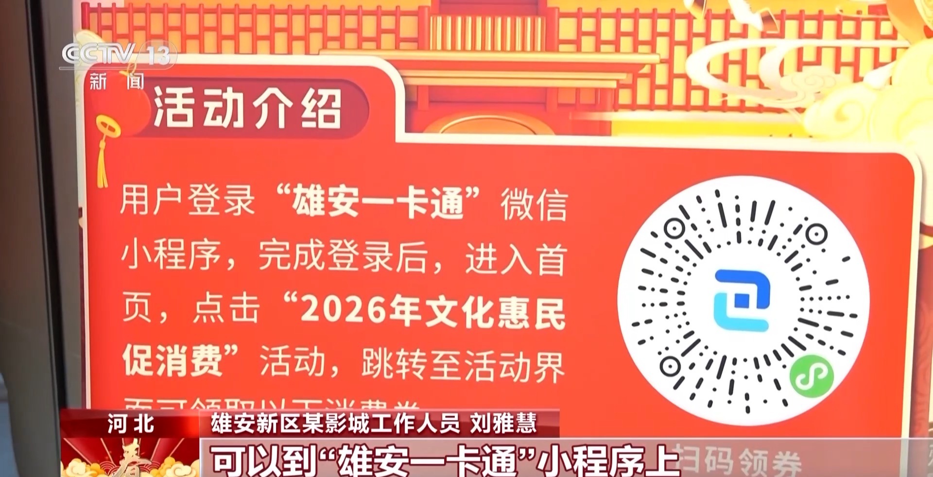 雄安新区某影城工作人员 刘雅慧:好多影迷朋友特地过来看贺岁档。线下观影的话,可以到“雄安一卡通”小程序上,领取一个20.01减20的券。使用这个券,10元就可以看一场春节档的影片。